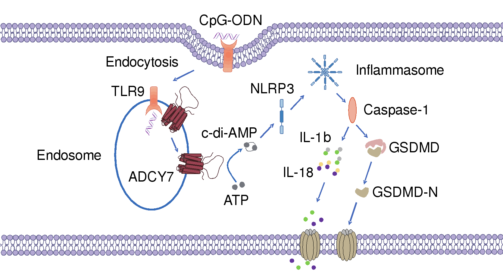 研究人员通过基因筛选,鉴定出腺苷酸环化酶ADCY7在TLR9诱导的NLRP3炎症小体激活中参与产生第二信号c-di-AMP,发挥关键的调控作用,发现了c-di-AMP在真核细胞中的产生及其生理功能,这使ADCY7成为无菌性炎症中调节NLRP3炎症小体的潜在靶点。