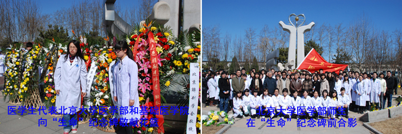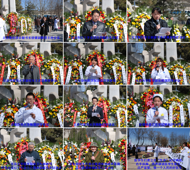 上午10点钟,来自北京协和医学院、北京大学医学部、首都医科大学、北京中医药大学、北京卫生学校、首都铁路卫生学校、北京护士学校等500余师生代表以整齐的队形肃立在庄严的 “生命”纪念碑前;庄严、肃穆的“生命”追思会在北京解剖学会秘书长徐健副教授的主持下正式开始。首先各单位代表向“生命”纪念碑敬献花篮和鲜花,全体人员向志愿捐献遗体者默哀致敬;随后,北京市红十字会吕仕杰副会长,北京解剖学会副秘书长武艳副教授、北京中医药大学副校长王庆国教授分别讲话,充分表达了首都医学科技工作者对众多志愿遗体捐献者的深切敬意和捐献者亲属的慰问。北京协和医学院田蕊、北京大学医学部张稚琪、首都医科大学陈璐、北京中医药大学熊敏、首都铁路卫生学校韩旭代表各校医学生先后发言,满怀激情的表达了莘莘学子们对“无言大体老师”的深深崇敬和无比感激。北京大学医学部志愿遗体捐献接受站负责人张卫光副教授代表北京市红十字会3个遗体捐献接受站作了发言,介绍了一些志愿遗体捐献者的感人事迹。 其中提到,北京医学院的老院长马旭教授,生前致力于医学教育事业,生后将自己彻底奉献,继续为解剖事业无私地做着贡献;还有北京大学年轻的研究生遗体捐献者-李菲、……,也都用他们的无私奉献和勇敢精神激励着在场的每个人。